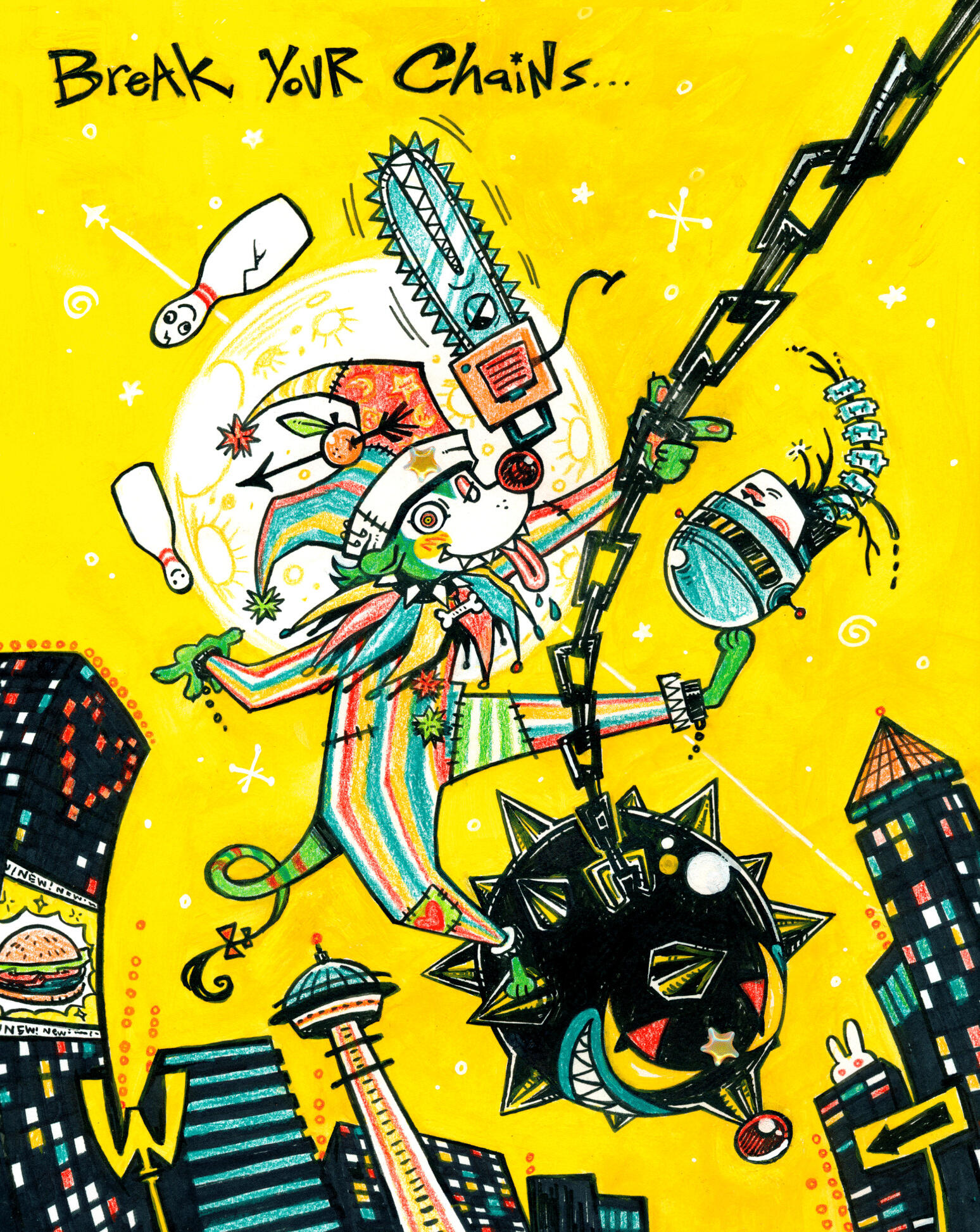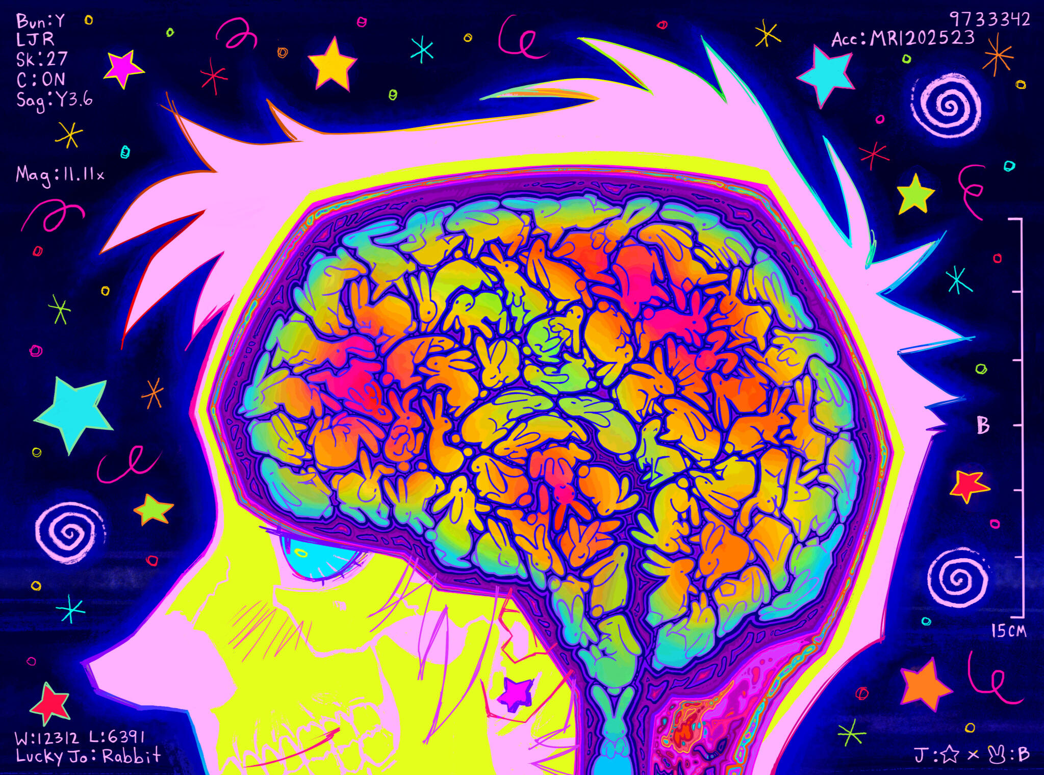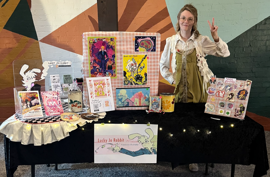 Born under a lucky star, Jorian (Lucky Jo Rabbit) is a young illustrator with a passion for shape and line. Her work reflects a sharp yet carefree state of mind, with playful compositions often telling a story within their chaotic confines. She tends to focus on themes of love, comedy, and emotional expression.In her teenage years, she was trained as a caricature artist by the team EcksRay Design, learning not only how to draw human features, but how to make people feel comfortable and open in her presence. After graduating High School, she attended the University of Science and Arts of Oklahoma for 4 years.After her schooling, she has gone on to provide work for several collaborative online zine projects, had her work permanently installed in the art galleries of Meow Wolf, and provided cover, comic, and article illustrations for Curbside Chronicle, a local magazine that helps fight homelessness. In her eyes, her artistic career is really just getting started!